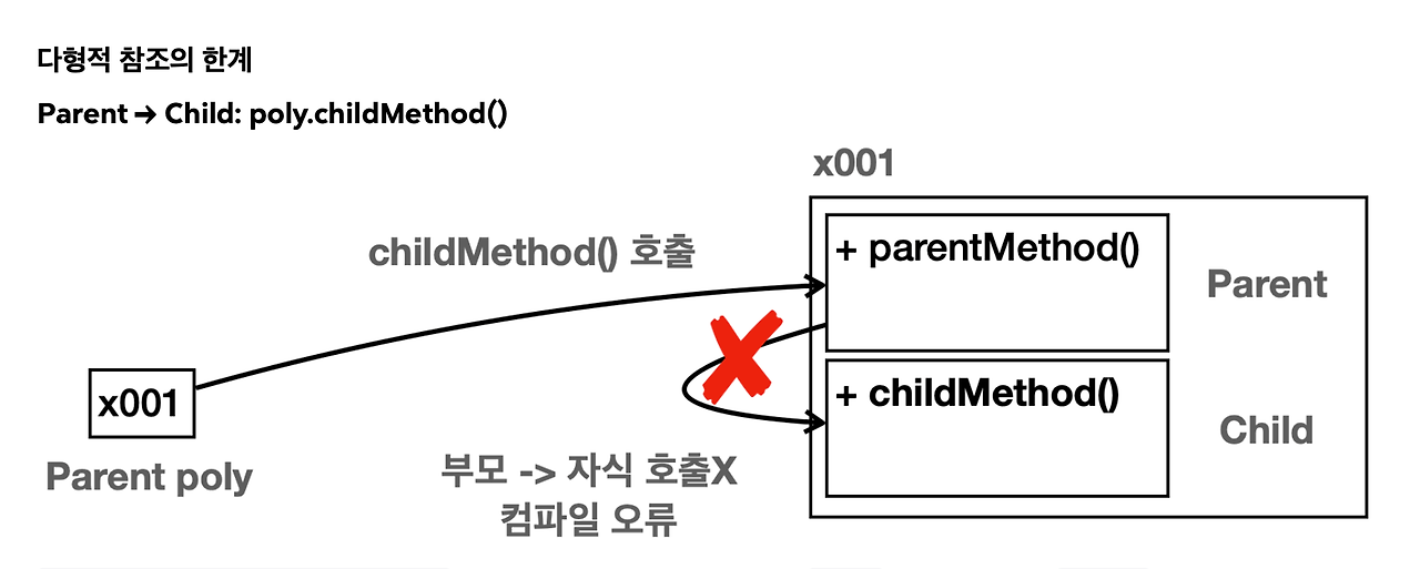 호출자인 poly는 Parent 타입이므로 Parent 클래스부터 시작해서 필요한 기능을 찾는다. 그런데, 상속 관계에서는 부모 방향으로 찾아 올라갈 수는 있지만, 자식 방향으로 찾아 내려갈 수는 없다. Parent는 부모타입이고 상위에 부모가 없다. 따라서 childMethod()를 찾을 수 없으므로 컴파일 오류가 발생한다.