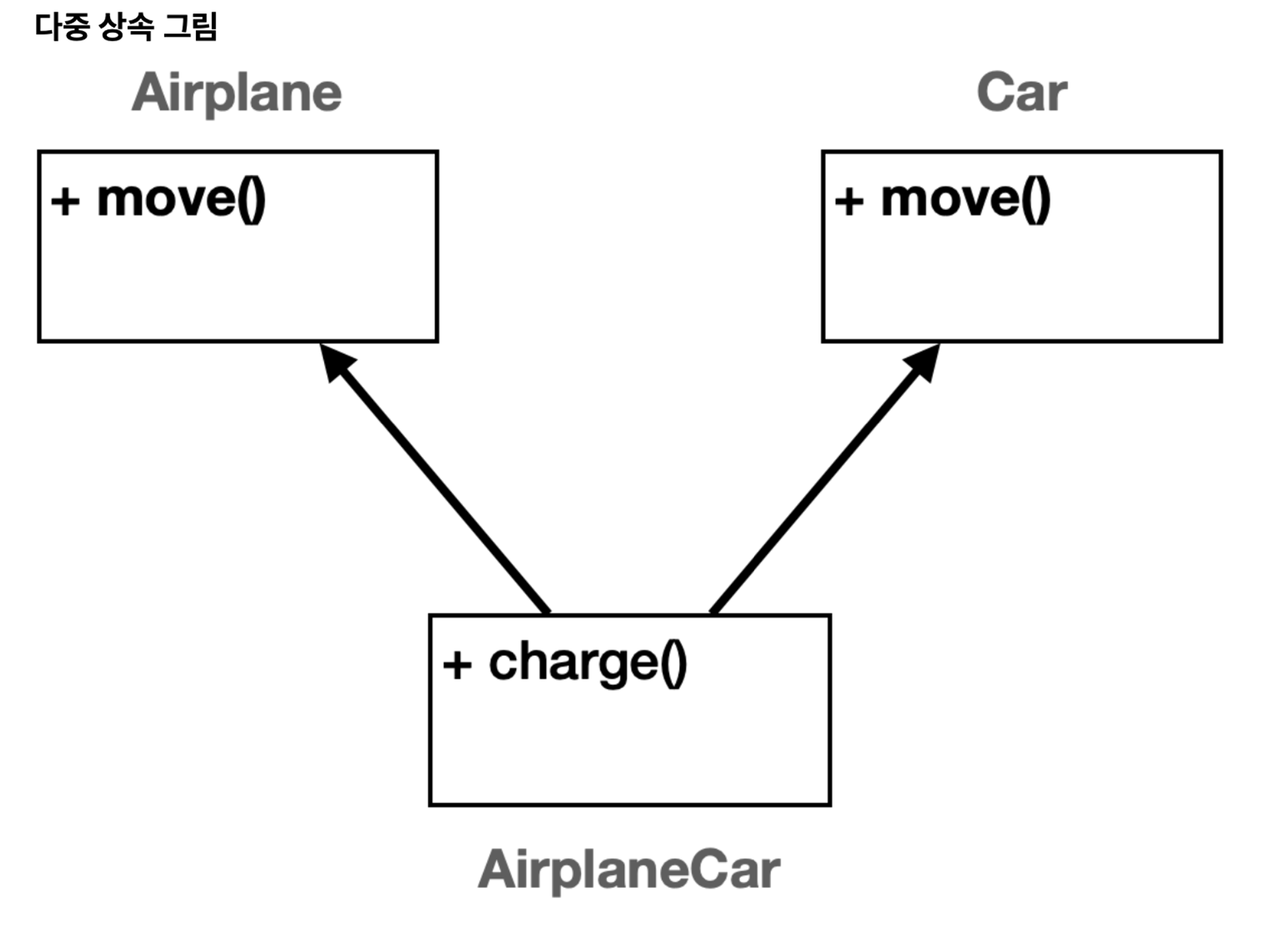 만약 비행기와 자동차를 상속받아서 나는 자동차를 만든다고 가정해 보자. 만약 그림과 같이 다중 상속을 이용하게 되면 AirplaneCar 입장에서 move()를 호출할 때 어떤 부모의 move()를 사용해야 할지 애매한 문제가 발생. 이것을 다이아몬드 문제라고 한다.