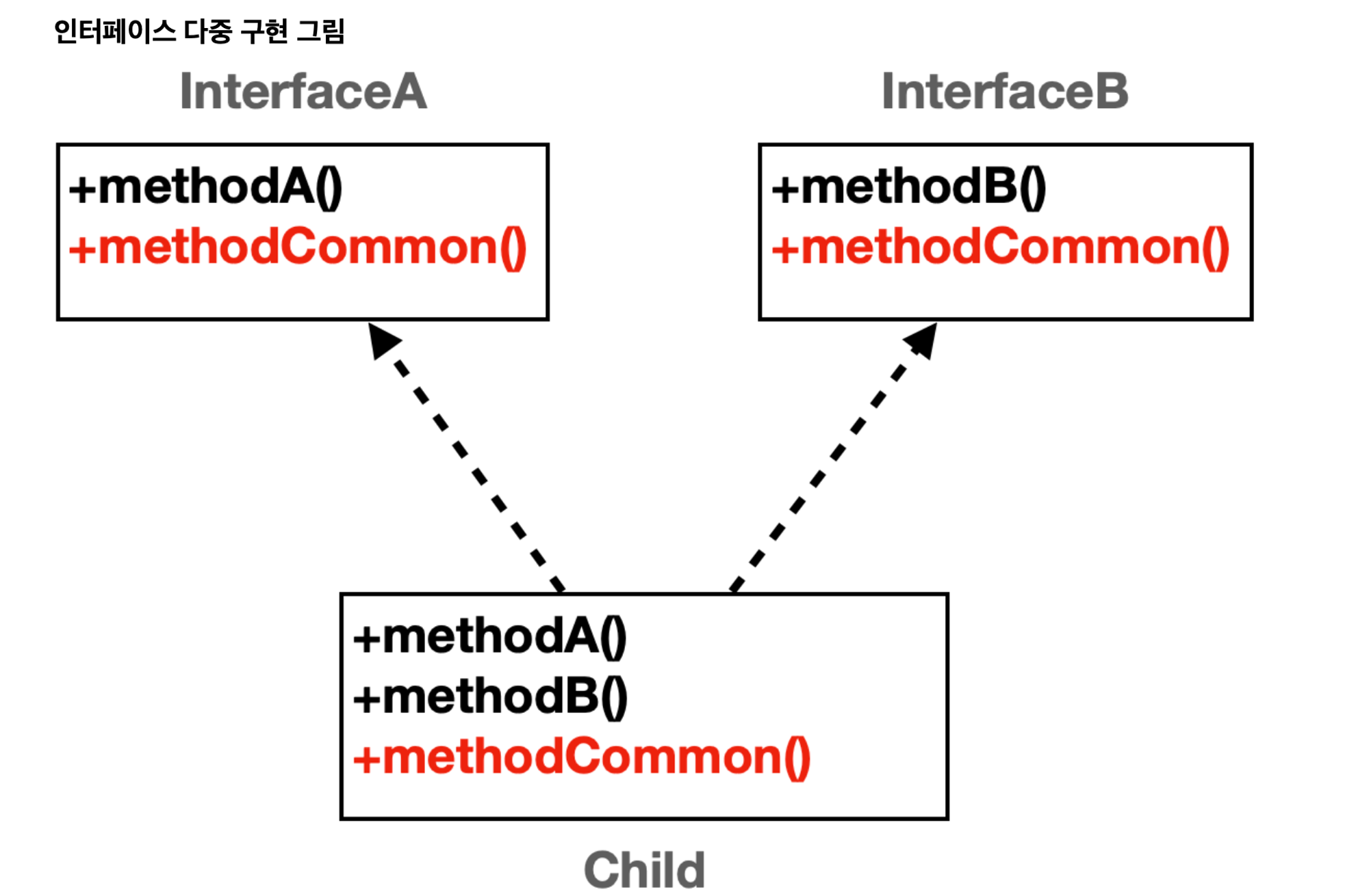 InterfaceA , InterfaceB는 둘다 같은 methodCommon() 을 가지고 있다. 그리고 Child 는 두 인터페이스를구현했다. 상속 관계의 경우 두 부모 중에 어떤 한 부모의 methodCommon() 을 사용해야 할지 결정해야 하는 다이아몬드 문제가 발생한다. 하지만 인터페이스 자신은 구현을 가지지 않는다. 대신에 인터페이스를 구현하는 곳에서 해당 기능을 모두 구현해야 한다.