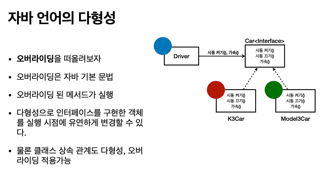 - 이들은 모두 '자동차'라는 기본 개념을 따르지만, 각자의 방식으로 그 기능들을 구현.