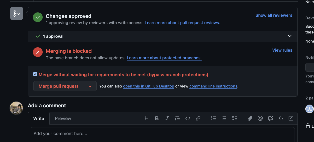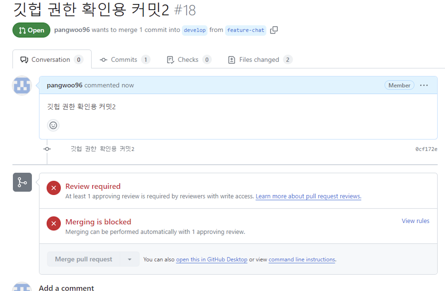 이렇게 팀원의 화면에서는 1개의 리뷰 승인이 있어야 되고, merge의 권한이 막혀있다.