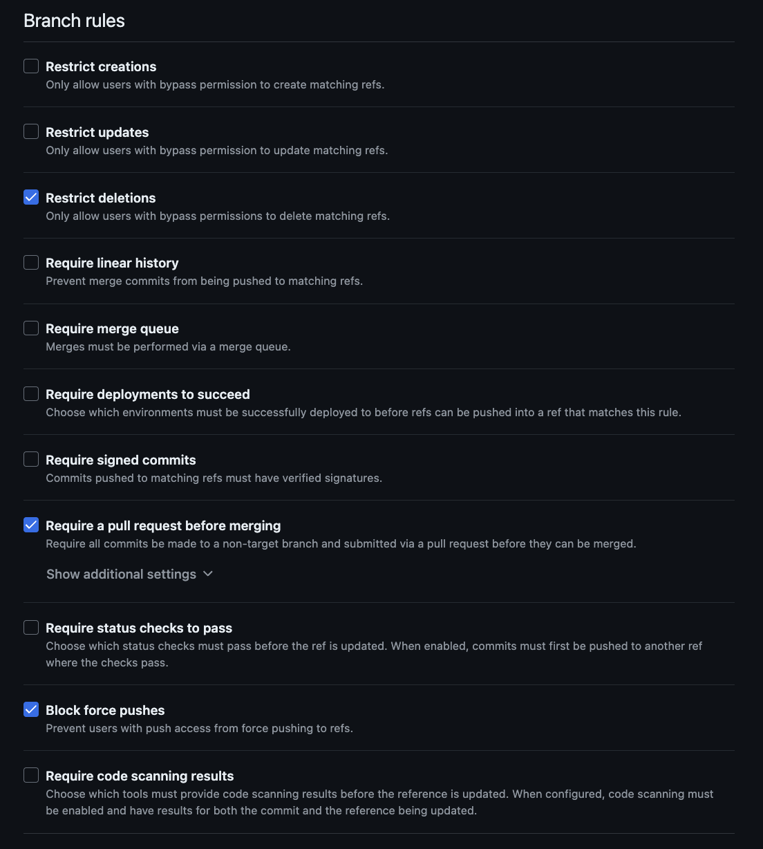 - Restrict deletions: 브랜치 삭제를 특정 권한(Bypass 권한)을 가진 사용자로 제한합니다.