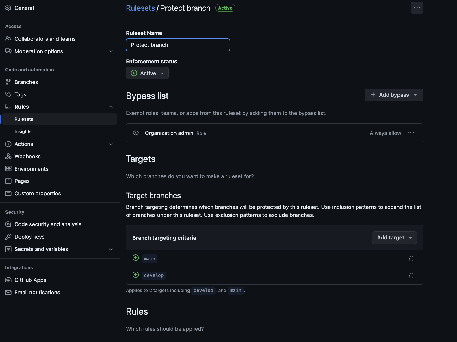 Target branches 에서는 보호할 브랜치를 정할 수 있다. 모든 브랜치를 포함하거나, 특정 이름의 패턴을 가진 브랜치를 보호할 수 있게끔 설정을 할 수 있었다. 나는 중요한 "main", "develop" 브랜치를 보호하기 위하여 이름 패턴을 설정하였다.