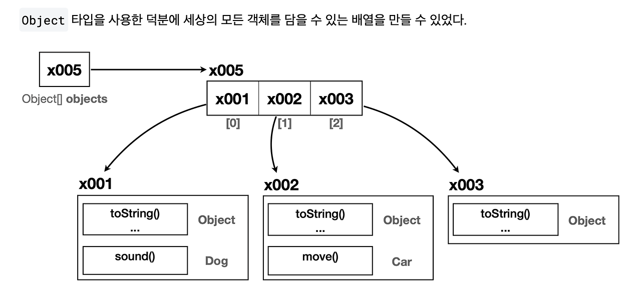 - 부모는 자식을 담을 수 있다. Obejct는 모든 클래스의 부모 클래스. 따라서 모든 객체를 참조할 수 있다.