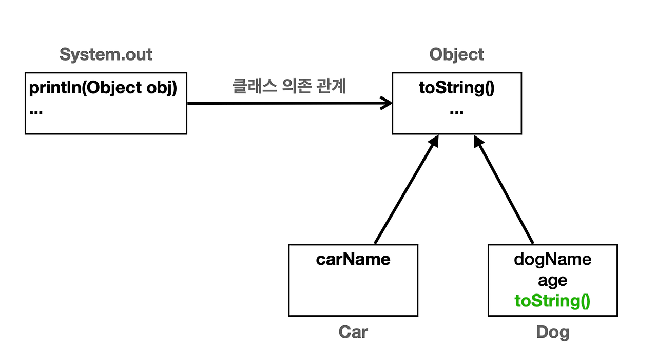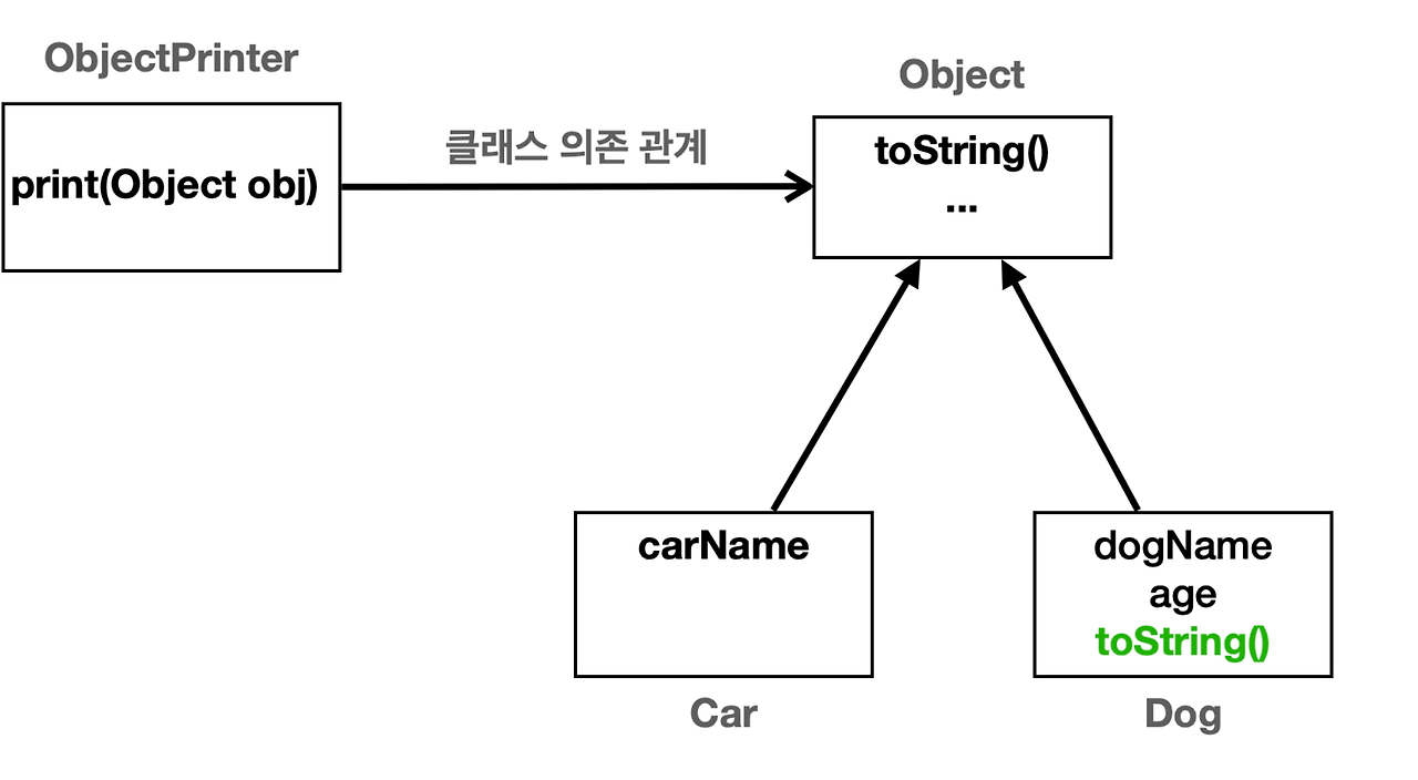 - 메서드 오버라이딩: Object 는 모든 클래스의 부모이다. 따라서 Dog , Car 와 같은 구체적인 클래스는Object 가 가지고 있는 toString() 메서드를 오버라이딩 할 수 있다. 따라서 print(Object obj) 메서드는 Dog , Car 와 같은 구체적인 타입에 의존(사용)하지 않고, 추상적인 Object 타입에 의존하면서 런타임에 각 인스턴스의 toString() 을 호출할 수 있다.