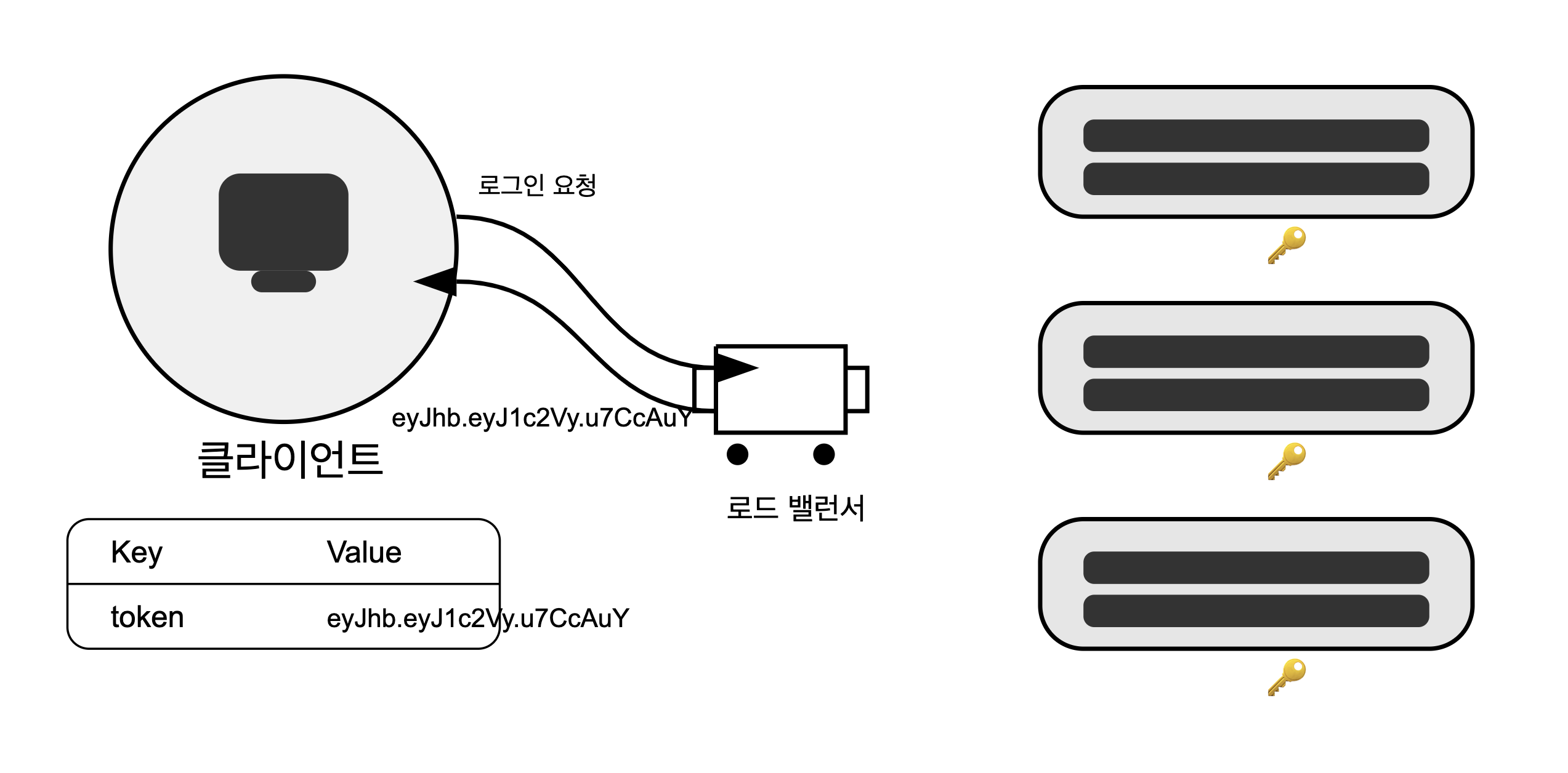 - 서버 중 하나가 요청을 처리하고 JWT 토큰(eyJhb.eyJ1c2 Vy.u7 CcAuY)을 생성.