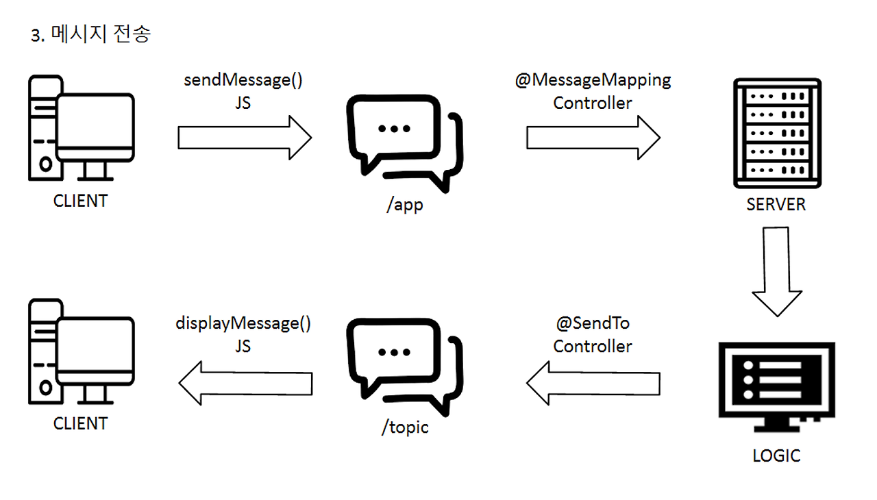 메시지를 전송하는 과정은 처음 클라이언트가 메시지를 입력하고 전송을 하면 sendMessage()라는 JS에서 정의한 메소드가 실행된다.