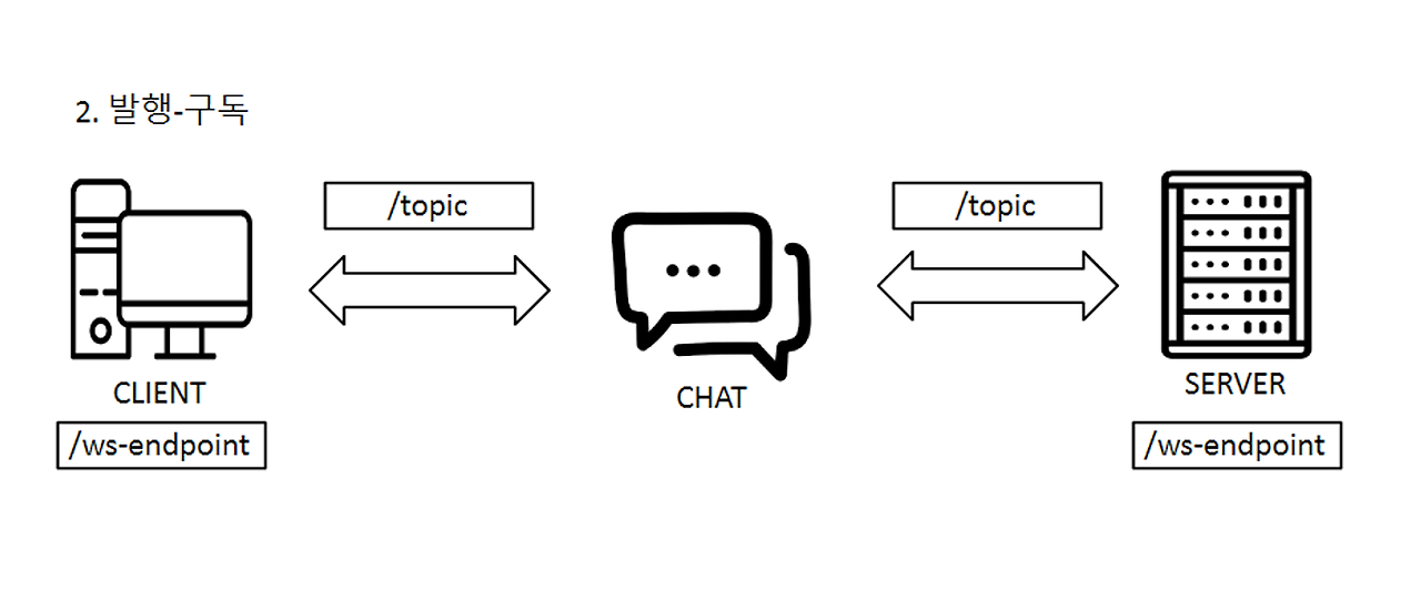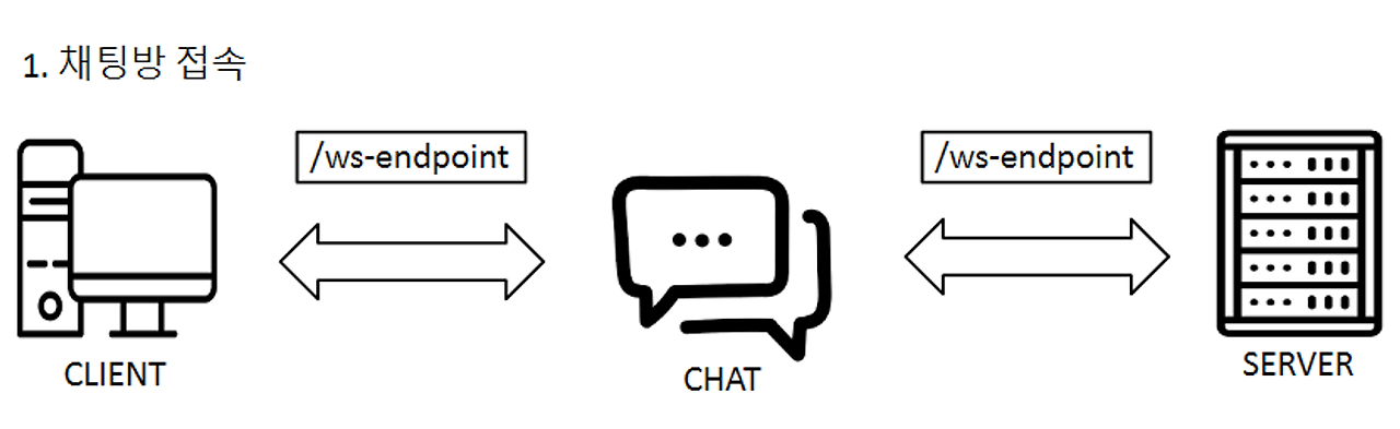 클라이언트가 채팅방에 접속했을 때, /ws-endpoint 라는 내부주소를 통해 서버와 클라이언트간 양방향 통신 채널이 열린다. 이 엔트포인트는 클라이언트가 접속을 종료할 때 까지 유지된다.