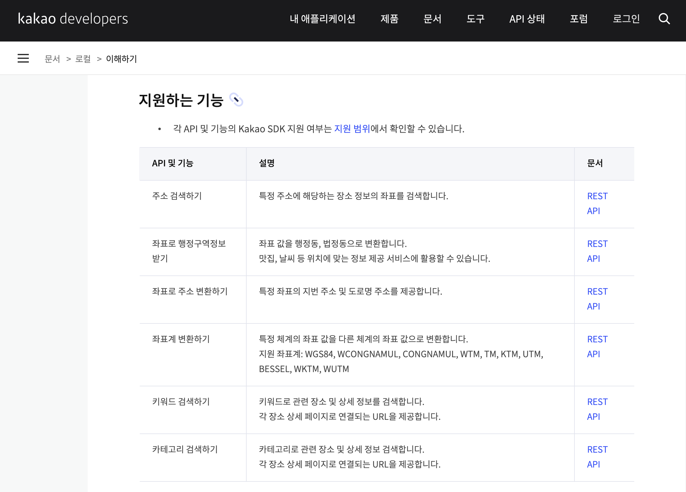 카카오톡 개발자센터에 들어가서. 지도/ 로컬 관련 (카카오톡 맵 관련 API 문서) API 문서를 들어가 보자.