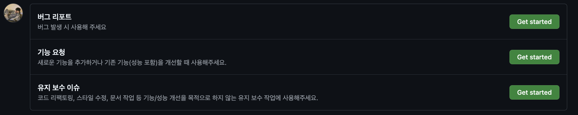 커밋, 푸시 이후 dev브랜치에 병합한 이후, Issues - New Issue 탭을 누르면 잘 적용된 것을 확인할 수 있다.