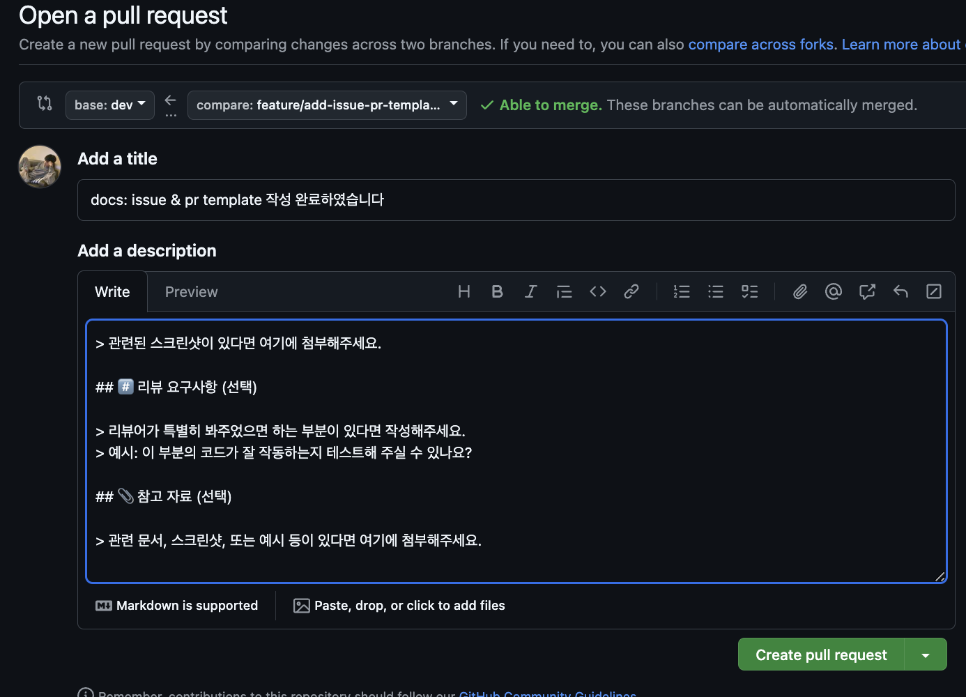 Issue와 마찬가지로 커밋, 푸시 이후 dev브랜치에 병합한 이후 Pr 생성 시 자동으로 template이 적용되는 것을 확인할 수 있다.