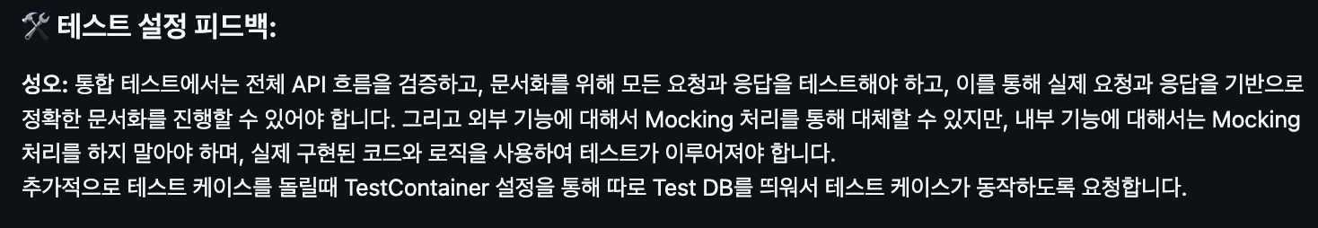 테스트 코드를 작성하면서 정말 많은 것을 배웠다. 팀원의 코드를 참고하며, 성공 시 응답 코드와 메시지, 에러 발생 시 코드와 메시지, 그리고 예외 처리 핸들러까지 다양한 부분을 테스트해야 한다는 것을 깨달았다.