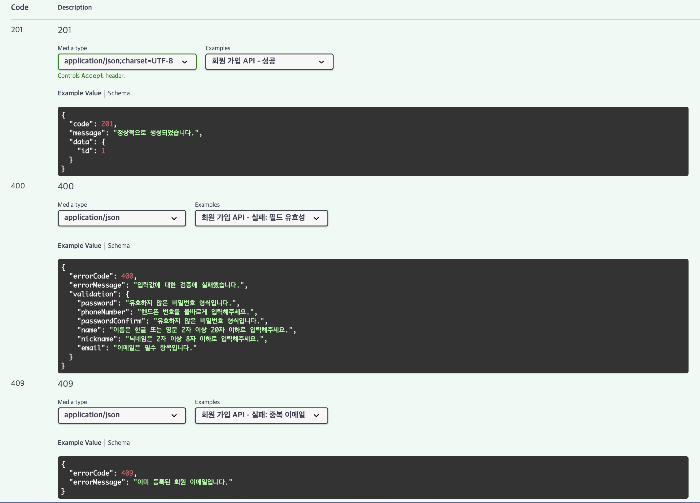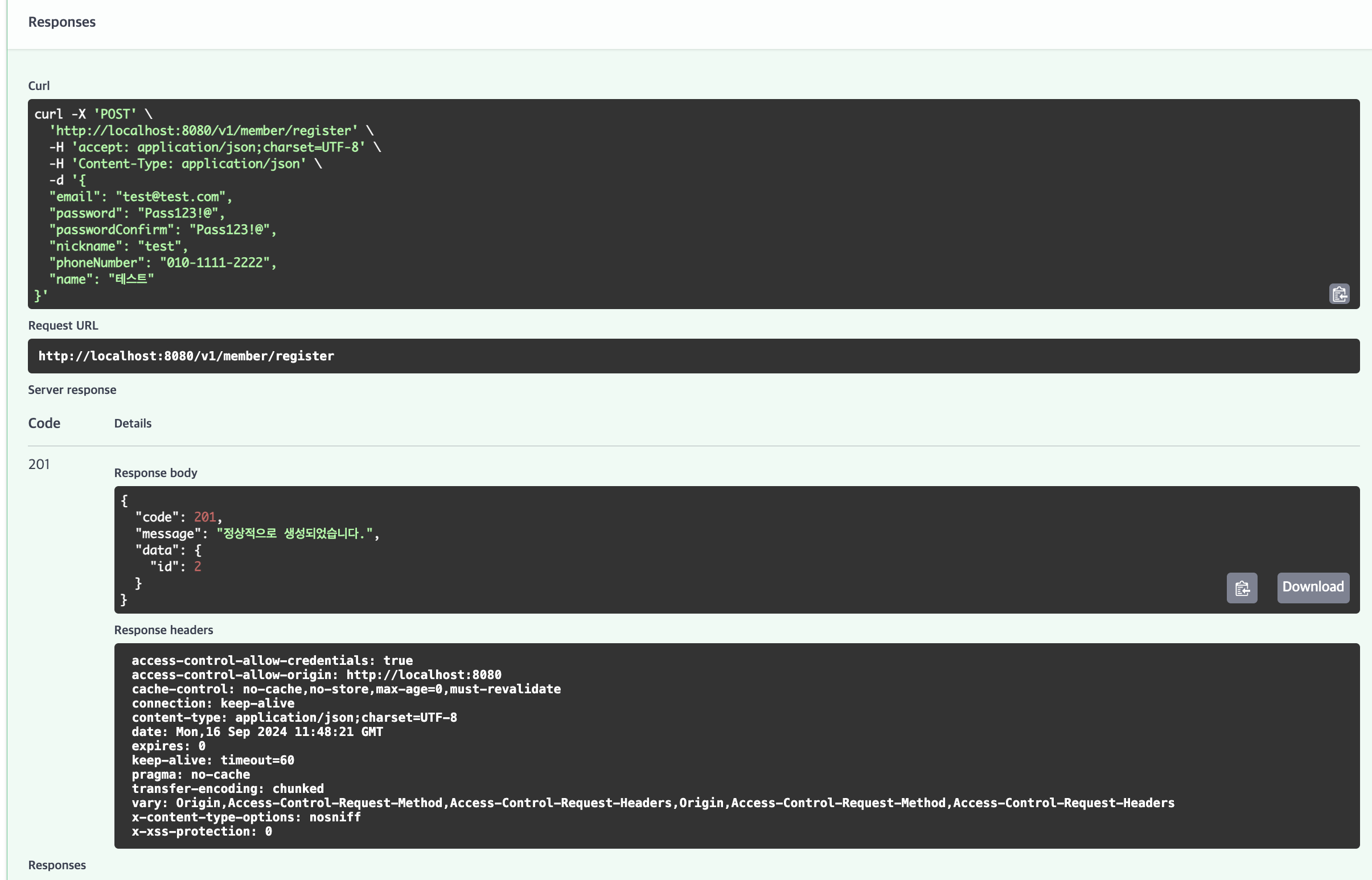 회원가입 API를 호출한 결과, 201(Created) 응답 코드를 확인할 수 있었다.