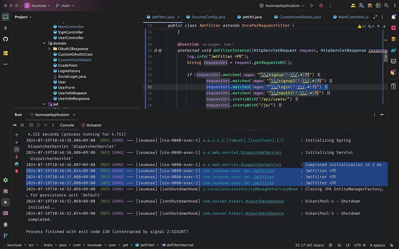 - JwtFilter: OncePerRequestFilter를 확장하여 요청을 가로채고 JWT 토큰을 검증.
