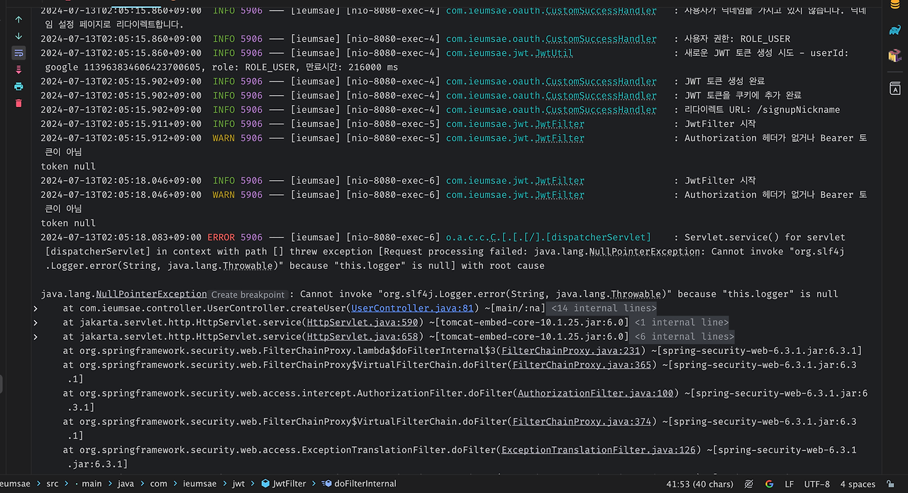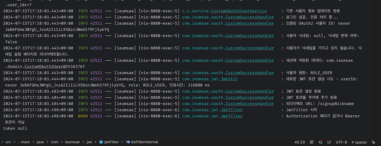 그럼 데이터가 제대로 안 박혔나? 토큰 전송이 안 됐나? 로그 보니까 리다이렉트 시작하고 그때부터 또 토큰을 못 찾네